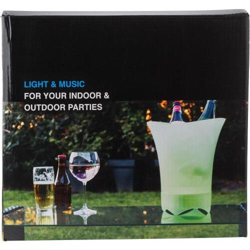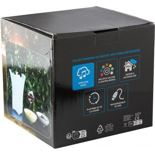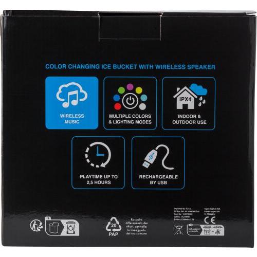 ABS-Eiskübel mit Lautsprecher. Farbwechselnde Lichter im Boden und drahtlose Technologie. 1200 mAh-Akku. Der Lautsprecher hat eine Leistung von 5 Watt. Pro Stück in einer farbigen Geschenkbox verpackt.