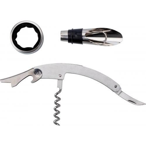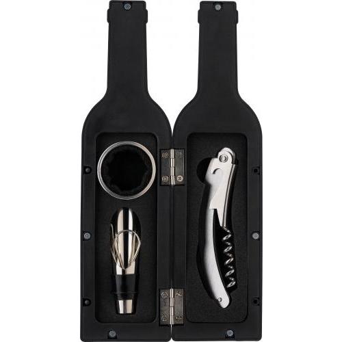 Weinset aus ABS, mit Kellnermesser, Flaschenverschluss mit Ausgießer und Tropfenfänger. Geformt wie eine Weinflasche.