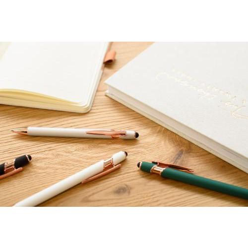 Kugelschreiber aus Aluminium mit roségoldenen Details. Blaue Tinte. Bei der Gravur wird das Design silberfarbig sein.