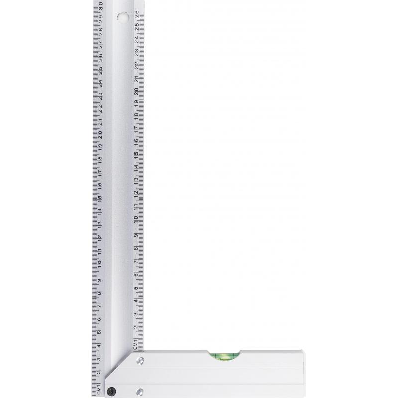 Aluminium-Dreieck mit integrierter Wasserwaage. Es ist 30 cm lang und verfügt über eine deutliche Zentimeteranzeige. Dank des praktischen Designs eignet es sich perfekt für präzises Messen und Nivellieren. Es ist einzeln verpackt in einem braunen Karton mit Abbildung.