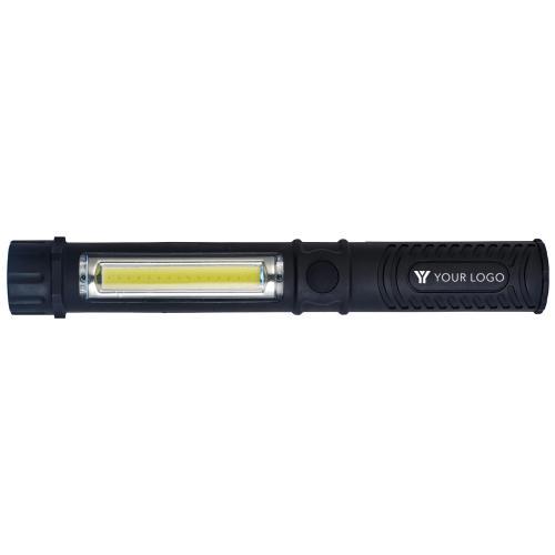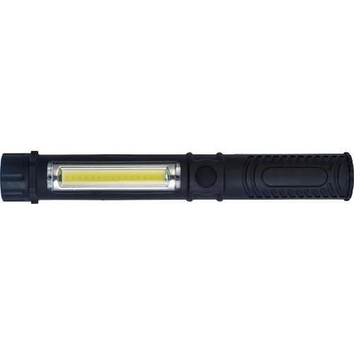 Arbeitslampe aus Kunststoff, mit runder COB-Leuchte vorne und einem COB-Leuchtstreifen an der Seite, Magnet und Kunststoffclip.