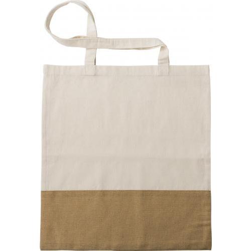 Einkaufstasche aus Baumwolle (160 g/m²) mit zwei großen Griffen. Jute-Imitat auf dem Boden.