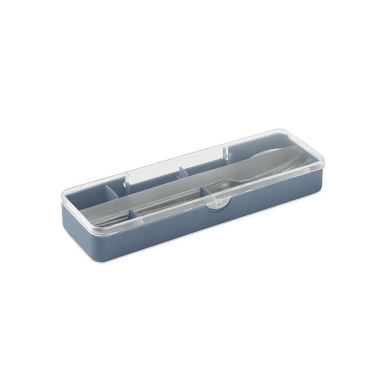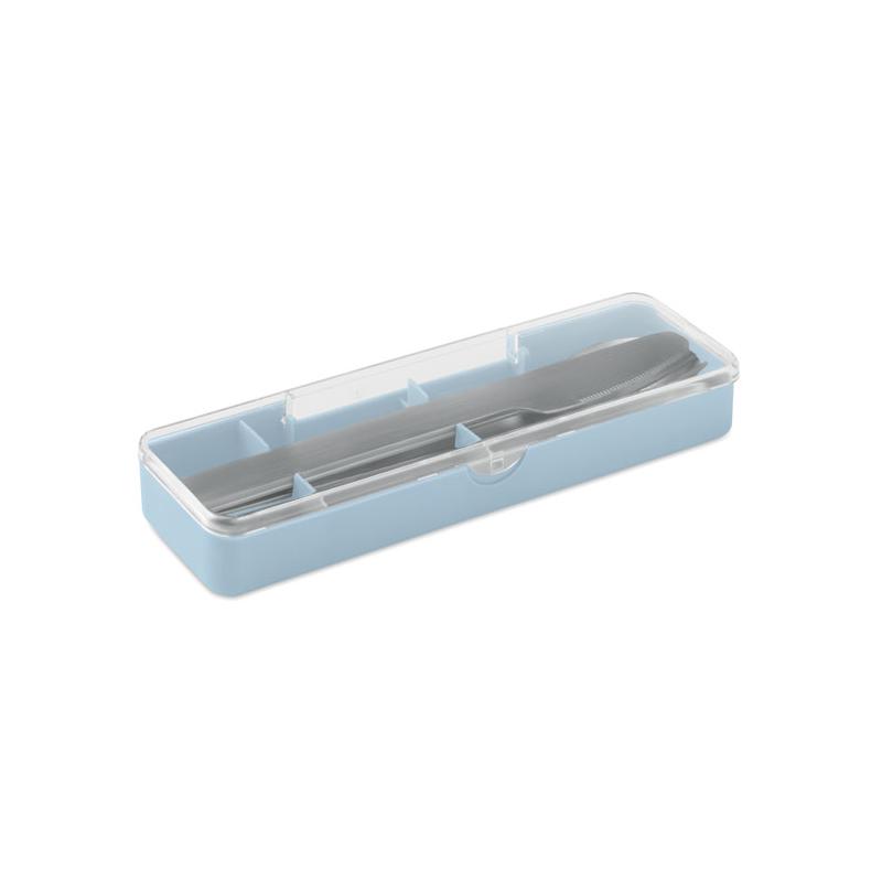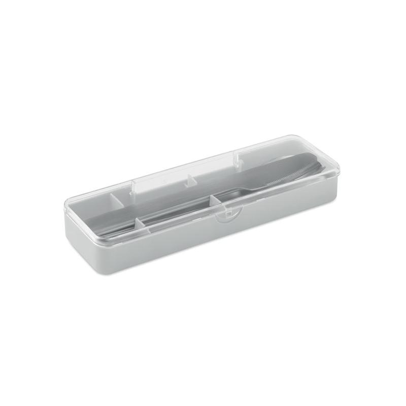 Besteck-Set aus edelstahl im pp-etui. Enthält messer, gabel und löffel.