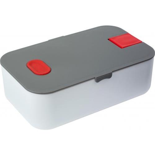 Brotdose (ca. 850 ml) aus Silikon und Kunststoff, trennbares Innenfach, mit farbigen Applikationen. Der Deckel kann als Handyhalter benutzt werden. Nicht spülmaschinengeeignet.