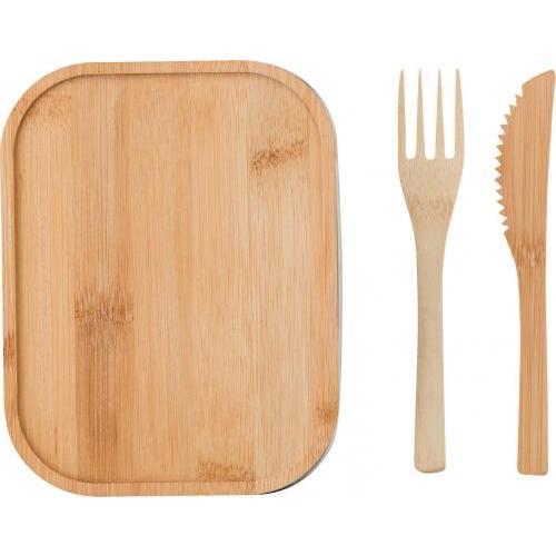 Brotdose aus Edelstahl (600 ml). Mit Bambusdeckel und zwei Besteckteilen (Gabel und Messer). Inklusive Nylongurt.