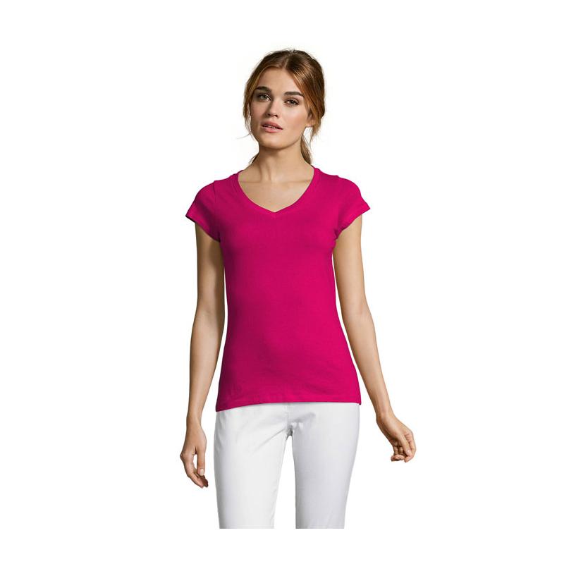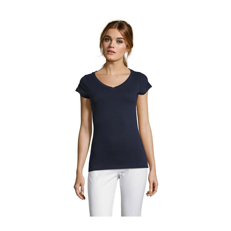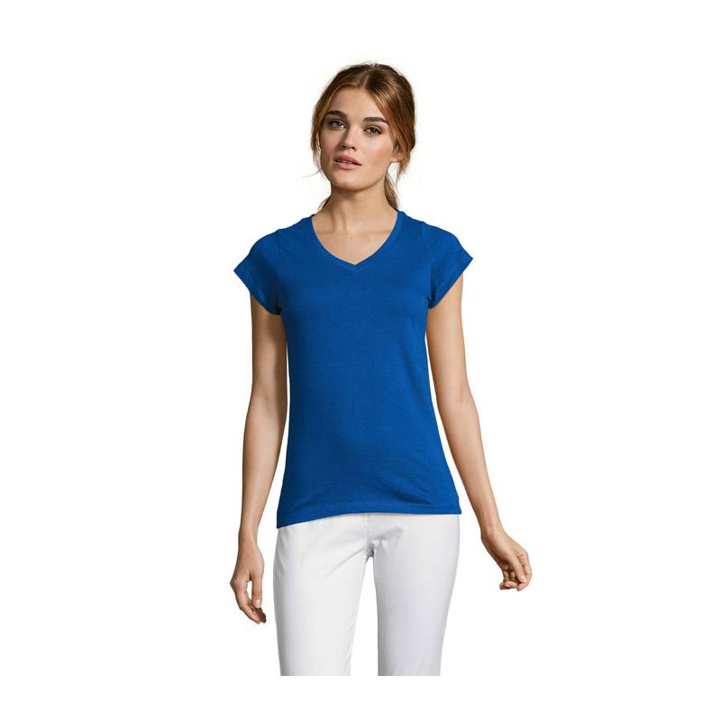 Sol's moon damen-t-shirt mit tiefem v-ausschnitt und taillierter schnittführung. Rippkragen, nackenband, kurzarm, seitennähte. Material: 150g m² 100% halbgekämmte, ringgesponnene baumwolle.