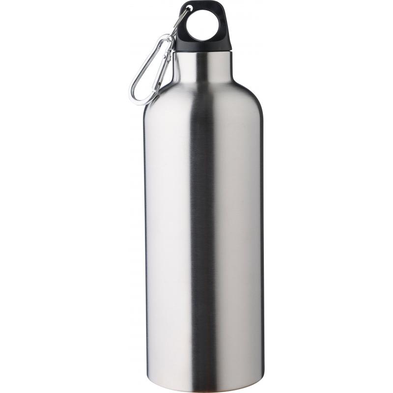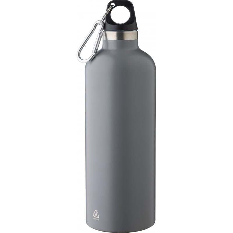 Doppelwandige Flasche aus recyceltem Edelstahl (s/s304) mit einem Fassungsvermögen von 500 ml, PP-Deckel und Aluminium-Karabinerhaken. Hält Getränke 8 Stunden warm und 12 Stunden kalt. Die Flasche hat eine matte Oberfläche (außer Silber) und ist mit einem eingravierten Recycling-Logo versehen. Einzeln verpackt in braunem Karton.