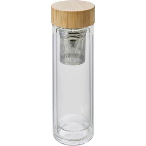 Flasche aus Bambus und Glas (420 ml), doppelwandig. Inklusive Tee-Ei aus rostfreiem Stahl. Einzeln verpackt in einem braunen Karton.