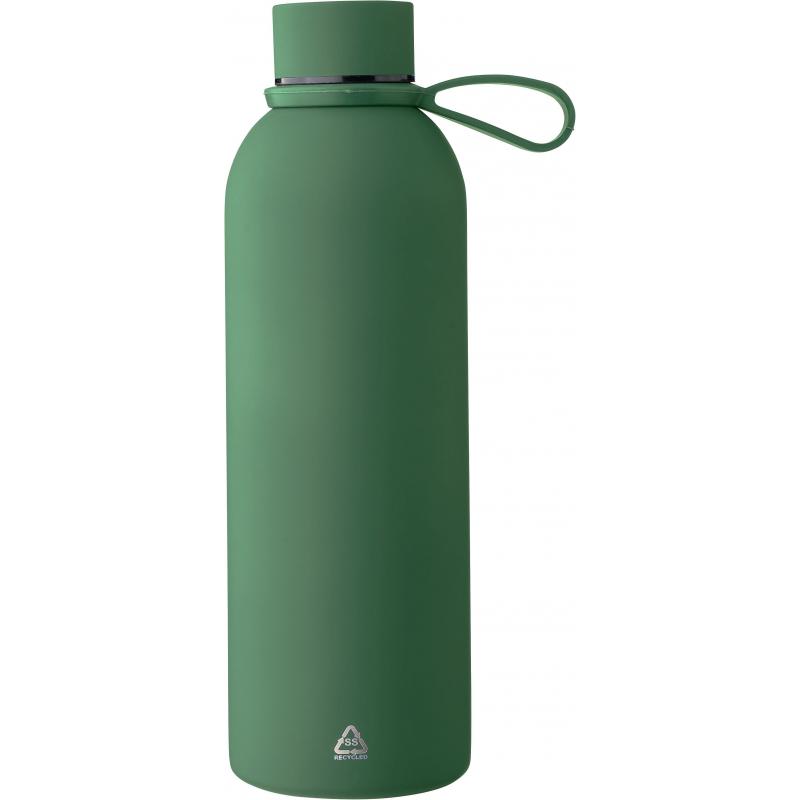 Diese doppelwandige Vakuum-Trinkflasche aus recyceltem Edelstahl (500 ml) ist mit einer Innenseite aus Edelstahl 304 und einer Außenseite aus Edelstahl 201 versehen. Sie ist mit einer gummierten Beschichtung für eine weiche Haptik ausgestattet. Sie verfügt über einen Schraubdeckel aus PP mit Metalldetails und eine Silikon-Trageschlaufe. Auf dem Korpus ist ein Recycling-Logo eingraviert. Die Flasche ist einzeln verpackt in einer braunen Pappschachtel.