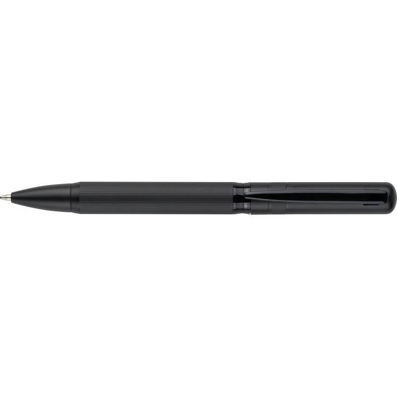 Ecobrass-Drehkugelschreiber mit farblich passendem Metallclip und Drehmechanik. Ausgestattet mit deutscher Dokumentenmine in Blau und einer ungefähren Schreiblänge von 1.000 Metern. Einzeln verpackt in einer schwarzen Schiebeverpackung.