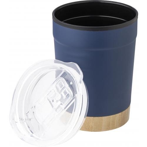Reisebecher aus Edelstahl (300 ml) mit PP-Innenseite und PS-Deckel. Mit Bambusboden, der von Hand gewaschen werden kann. Einzeln verpackt in einer braunen Pappkarton.