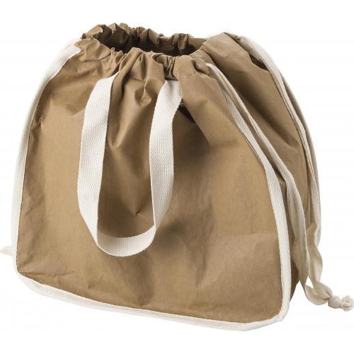 Waschbare Einkaufstasche aus Kraftpapier mit TC-Futter (250 gr/m²). Mit zwei kurzen Henkeln und zwei Schnüren zum Verschnüren der Tasche.