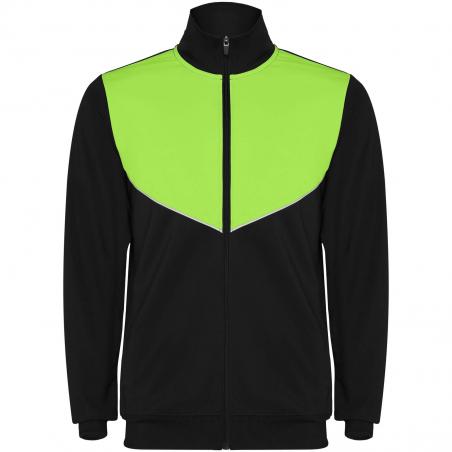 Trainingsanzug aus leichtem und elastischem Stoff. jacke mit farblich abgesetzten nähten im Brustbereich. hoher kragen mit Kontrastnähten. zentraler Frontreißverschluss. Seitentaschen. 2x2-Rippenbündchen an ärmeln und Bund. hose mit elastischem bund und Kordelzug. seitliche kontrasteinsätze mit Steppnaht. beinsaum mit Reißverschluss.