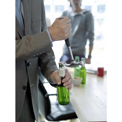 Flaschenöffner aus Metall in Form eines Hammers, inklusive Gummi-Griffzone und Kapselheber.