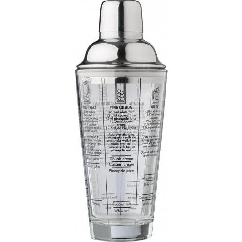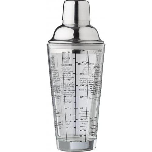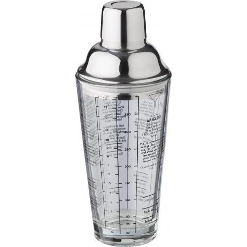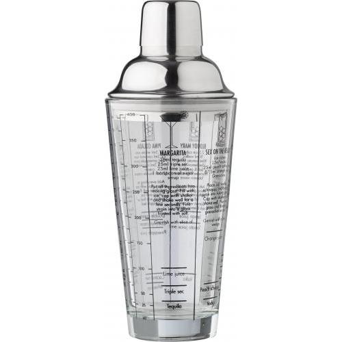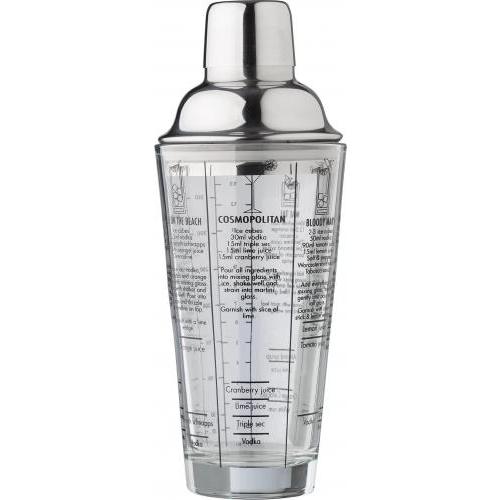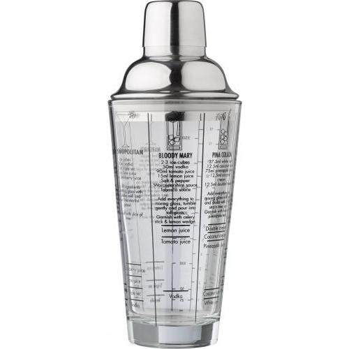 Cocktailshaker aus Glas (400 ml) mit Deckel aus Edelstahl (s/s304). Cocktailrezepte auf der Seite aufgedruckt. Einzeln verpackt in einer braunen Kartonbox.