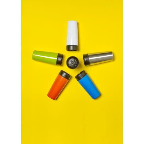 Isolierbecher aus Edelstahl, farbig lackiert, doppelwandig, mit Anti-Rutsch-Matte auf der Unterseite, Kunststoff-Deckel und Schnellverschluss, Inhalt ca. 450 ml.