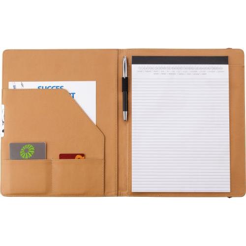 Konferenzmappe aus Kork, ca. DIN A4-Format, mit 3 Einsteckfächern, Stifthalter, inklusive Verschlussband und Schreibblock (20 linierte Blätter, etwas kleiner als DIN A4 Format).
