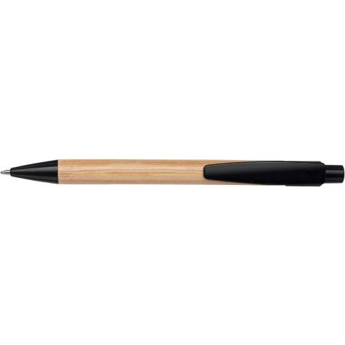 Kugelschreiber aus Bambus, mit Applikationen aus Kunststoff und blauer Mine.