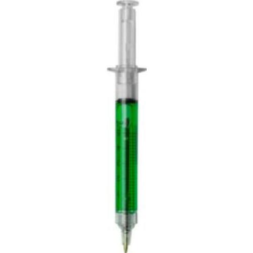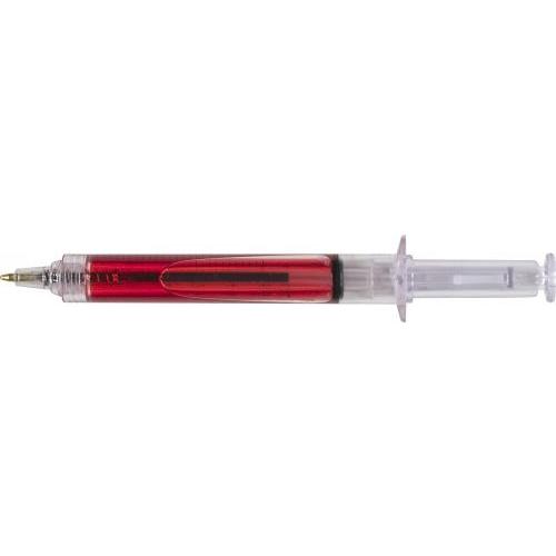 Kugelschreiber aus Kunststoff in Spritzenform, mit schwarzer Mine.