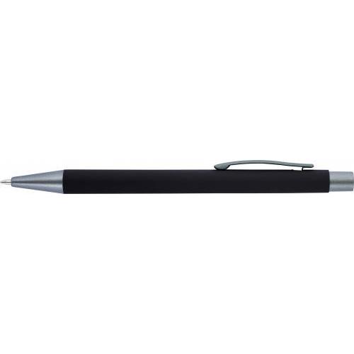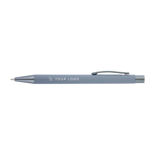 Kugelschreiber mit Softtouch-Oberfläche. Der Knopf, der Clip und Spitze sind farblich zueinander passend. Kann nur in Schwarz, Weiß, Silber und Gold bedruckt werden. Mit blauer Mine.