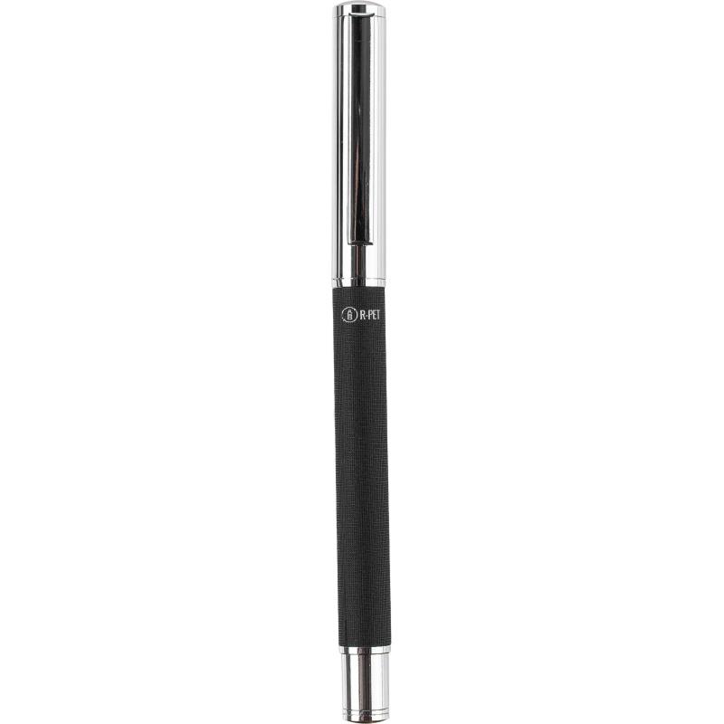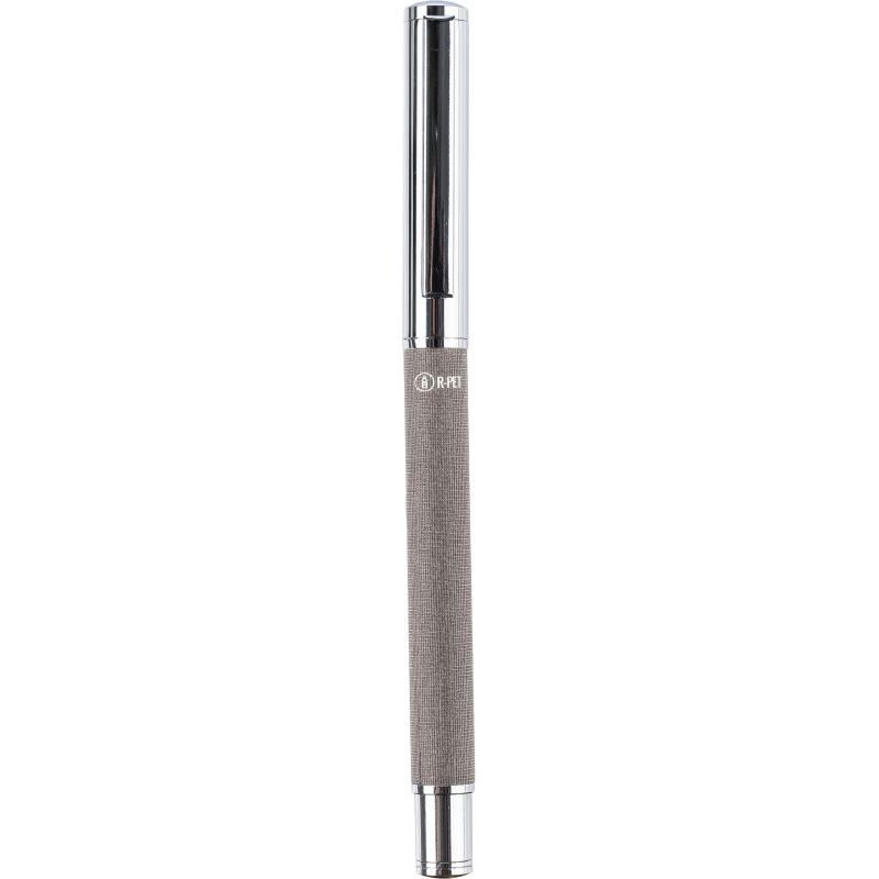 Dieser Rollerball-Stift ist aus Messing und rPET gefertigt und verfügt über einen Metallclip sowie ein Griffstück. Er verfügt über einen Schiebemechanismus und ein rPET-Logo auf dem Gehäuse. Er ist einzeln verpackt in einer braunen Pappschachtel. Blaue Tinte.