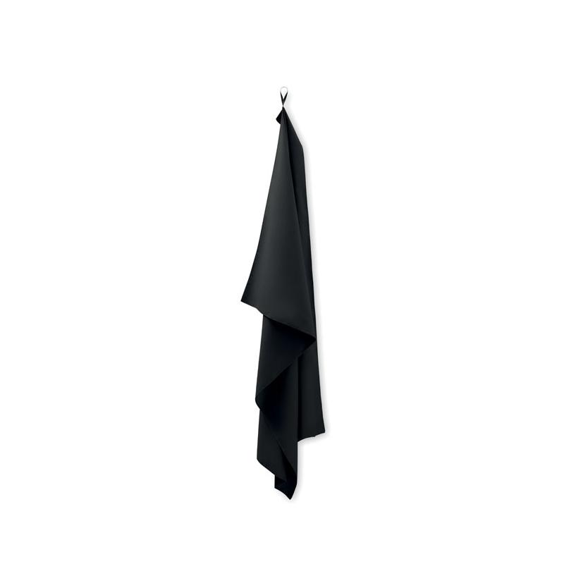 Handtuch aus mikrofaser. 90% polyester und 10% polyamid mit elastikschlaufe. Leicht schnell trocknend. Maße: 100 x 150 cm.
