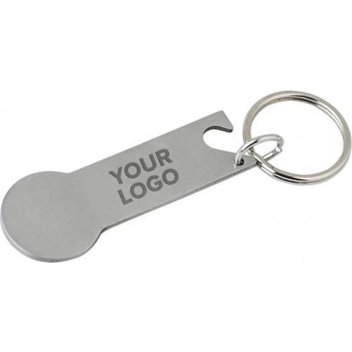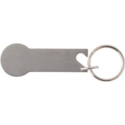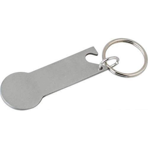 Multifunktionaler Schlüsselanhänger aus Edelstahl mit Einkaufswagenmünze und Flaschenöffner. Verpackt im Polybeutel.