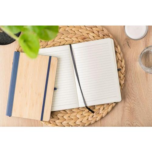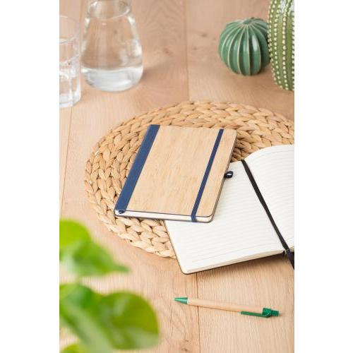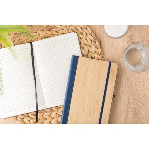 PU-Notizbuch mit Bambuseinband (ca. A5), mit 96 linierten Seiten und Gummiband.