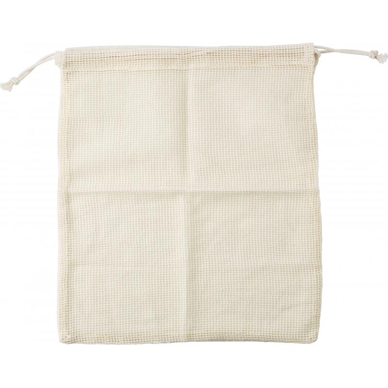 Obst- und Gemüsebeutel aus 100% Bio-Baumwolle mit einseitigem Netzgewebe und Kordelzugverschluss.