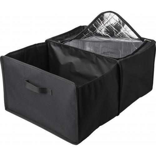 Autotasche aus Polyester (600D). Zwei Fächer, eine Kühltasche mit Reißverschluss geschlossen. Aluminium innen auf der Seite der Kühltasche. Zusammenklappbar.