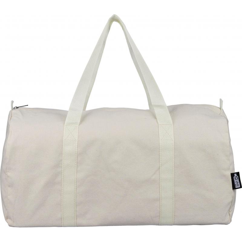 Reisetasche aus recyceltem Polycotton (330 g/m²) mit großem Reißverschlussfach oben. Mit langen Tragegriffen (100 cm lang, 3 cm breit) und passendem Gurtband. Fassungsvermögen ca. 30 Liter. Mit rPET-Etikett außen und Recycling-Etikett innen