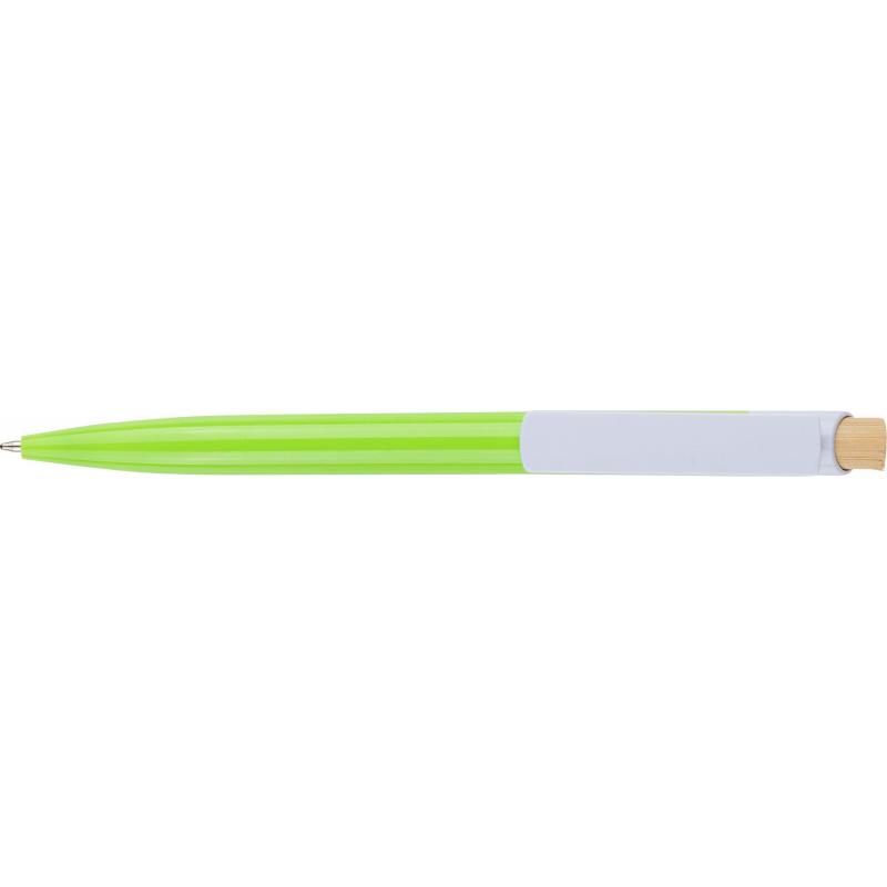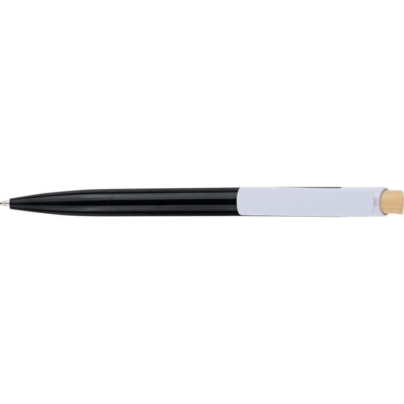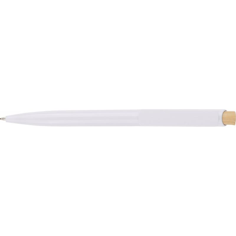 Recycelter ABS-Kugelschreiber mit Bambus-Druckknopf und weißem Clip. Mit recyceltem Logo im In-Mould-Verfahren. Ungefähre Schreiblänge 600 Meter. Blaue Tinte.