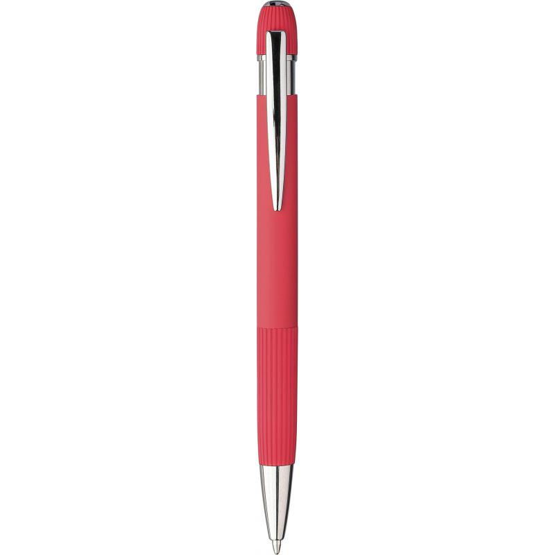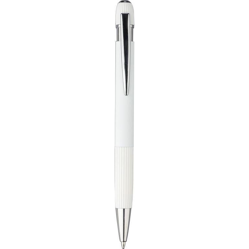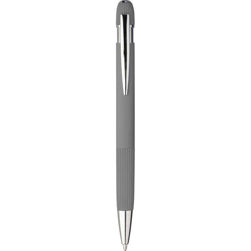 Dieser Kugelschreiber ist aus recyceltem Aluminium gefertigt und verfügt über eine gummierte Oberfläche. Er verfügt über gestreifte Details am Griff und auf der Oberseite, eine verchromte Kunststoffspitze sowie einen Druckknopf mit Metallclip. Das Recycelt-Logo ist lasergraviert. Blaue Tinte.