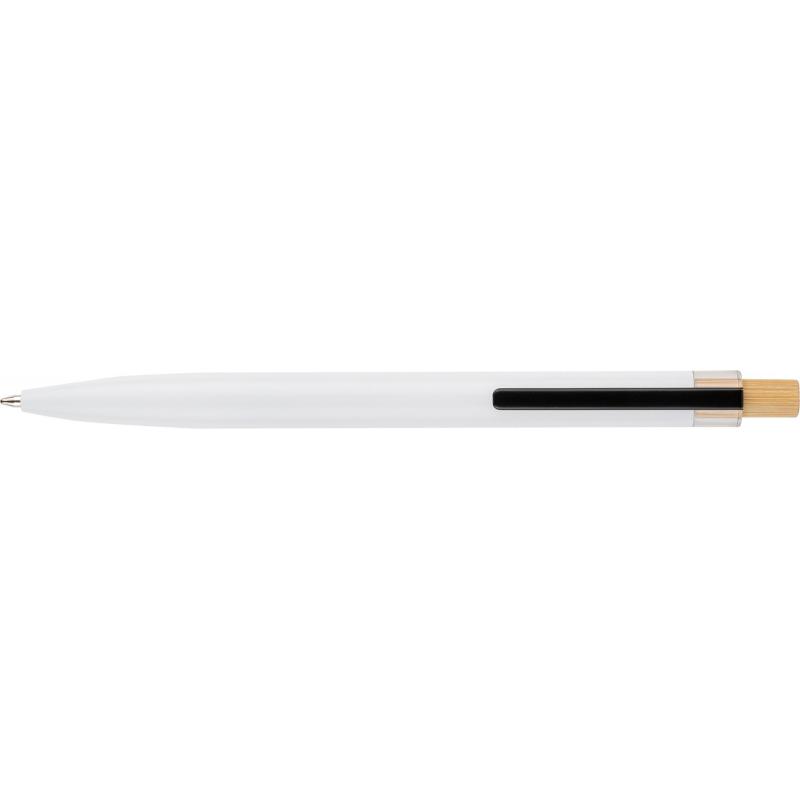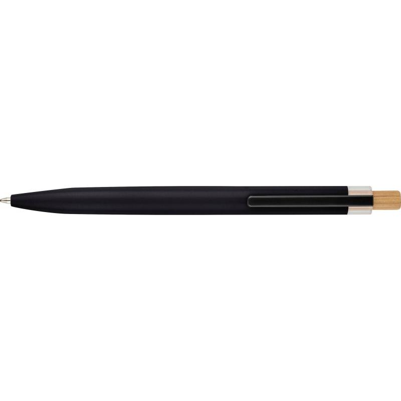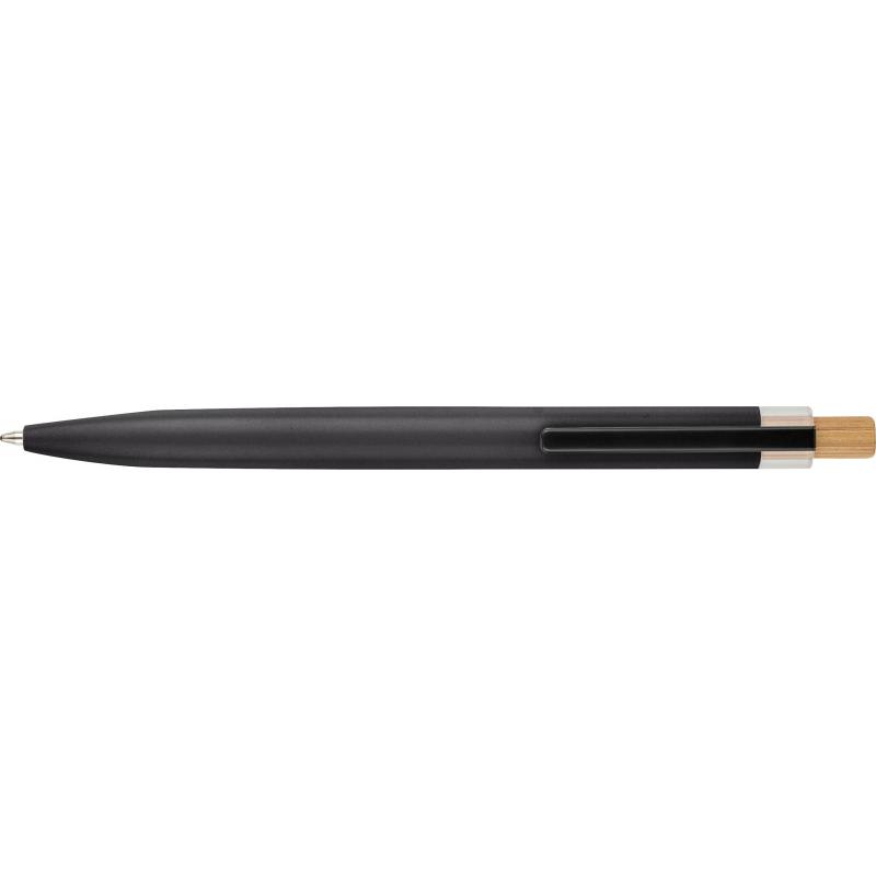 Druckkugelschreiber aus recyceltem Aluminium mit Bambusdrücker, rPET-Besatz und Metallclip. Mit eingraviertem Recycling-Logo. Schreiblänge ca. 700m. Blaue Tinte.