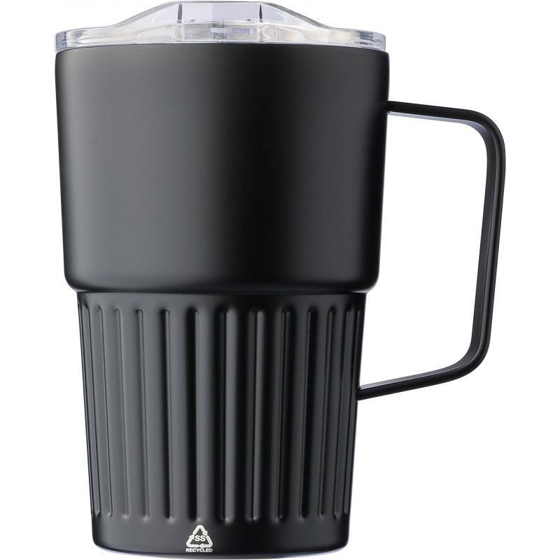 Recycelter doppelwandiger Trinkbecher aus Edelstahl (450 ml). Die Innenseite besteht aus Edelstahl 304, die Außenseite aus Edelstahl 201. Er verfügt über einen geriffelten Henkel und einen stabilen Henkel. Mit AS-Deckel mit Schiebeverschluss. Auf dem Becher ist ein graviertes Recycling-Logo zu sehen. Der Becher ist einzeln in einem braunen Karton verpackt.