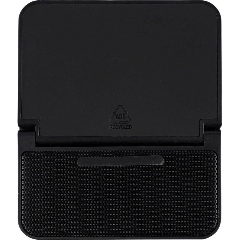 3-in-1-Wireless-Ladegerät, Lautsprecher und Handyhalterung aus recyceltem ABS in würfelförmigem Design. Mit 15-W-Schnellladefunktion, 5-W-Lautsprecherfunktion und Wireless-Connection-Technologie Version 5.4. Mit 1200-mAh-Akku, Metallgitterfront und recyceltem PU-Detail auf der Oberseite. Eingang: 5 V/500 mA. Mit Recycling-Logo gekennzeichnet. Einzeln verpackt in einem braunen Karton.