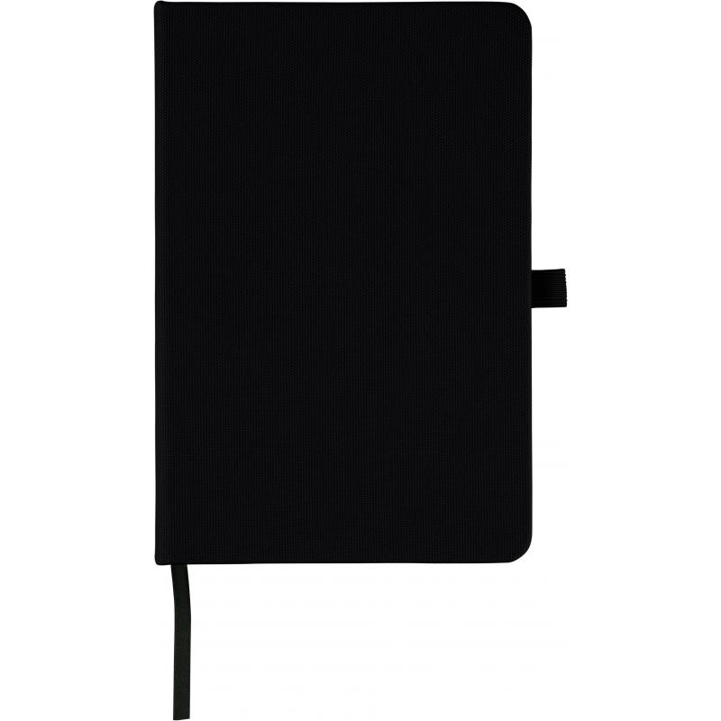 Notizbuch aus rPET-600D-Polyester mit PU-Beschichtung im Papierformat A5. Es enthält 80 Blatt liniertes Papier mit einer Grammatur von 70 g/m² und verfügt über ein Lesezeichenband, ein Gummiband sowie eine Stifthalterung. Das Cover ist halbgebunden. Auf der Rückseite ist ein geprägtes Recycling-Logo zu sehen.