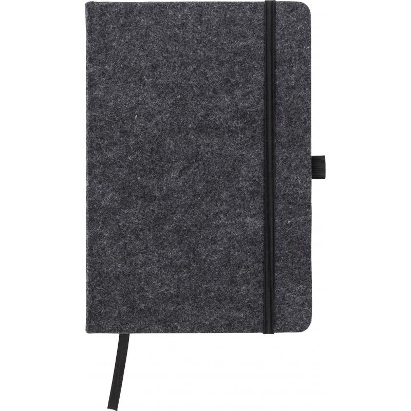 Notizbuch aus rPET-Filz (A5), mit 160 linierten Seiten, Stiftschlaufe, Lesebändchen und Gummiband über dem Umschlag.