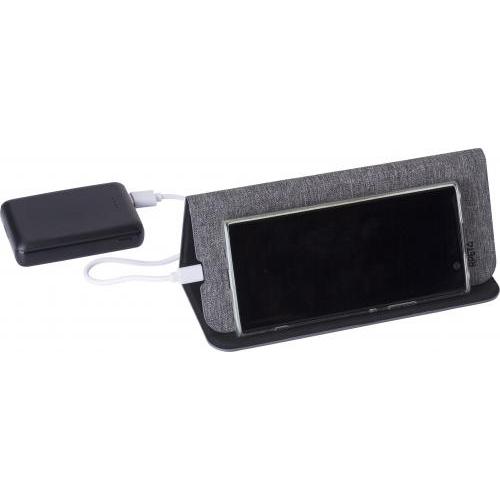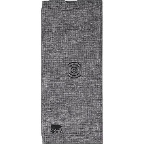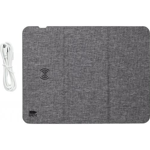 rPET drahtlose Schnell-Ladematte (10W). Zusammenklappbar zur Verwendung als Telefonständer. Verpackt pro Stück in braunem Karton. Mit rPET-Logo.