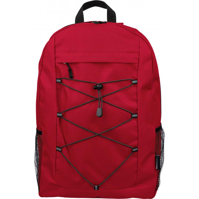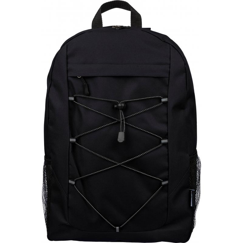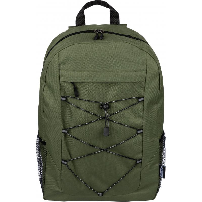 Abenteuerrucksack aus rPET-Polyester 600D mit Kordelzugverschluss und großem Hauptfach mit Reißverschluss. Mit Netzseitentaschen, elastischen Frontbändern zur Befestigung einer Decke oder Flasche und einer kleinen offenen Reißverschluss-Fronttasche zur Dekoration. Inklusive verstellbarer Riemen und rPET-Etikett.