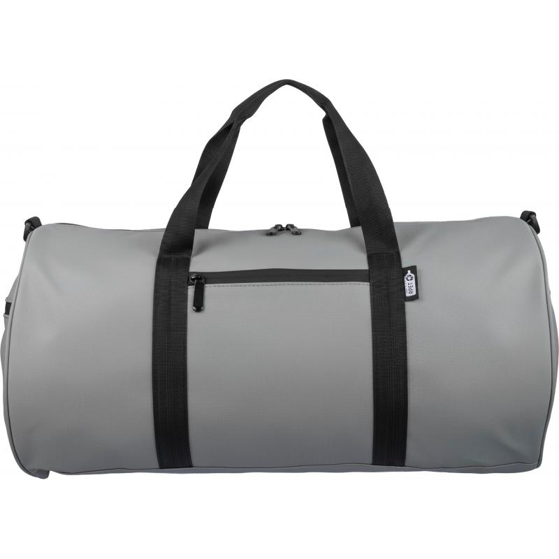 rPET-Reisetasche aus 600D Polyester mit 210D Futter und wasserabweisender PU-Beschichtung. Mit großem Hauptfach mit Reißverschluss, kleiner Reißverschluss-Fronttasche zur Dekoration, zusätzlicher kleiner Reißverschluss-Seitentasche und einer Netz-Seitentasche. Ausgestattet mit zwei Tragegriffen und einem verstellbaren Schultergurt. Fassungsvermögen 40 Liter. Inklusive rPET-Etikett auf der Außenseite.