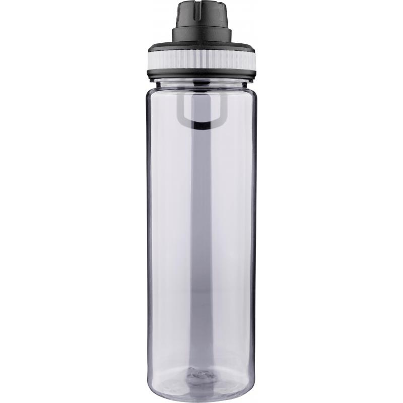 Trinkflasche aus rPET (750 ml) mit PP-Deckel, Tragegriff und Schraubverschluss. Der Deckel verfügt über farbige Silikondetails, die zum transparenten Flaschenkörper passen.