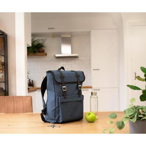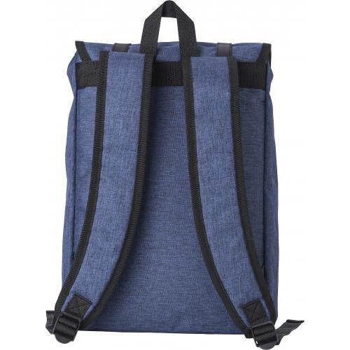 Rucksack aus Polyester (300D + 210D) mit Hauptfach und Vordertasche. Die Lasche wird mit zwei Schnallen verschlossen. Die Schultergurte sind gepolstert und verstellbar.