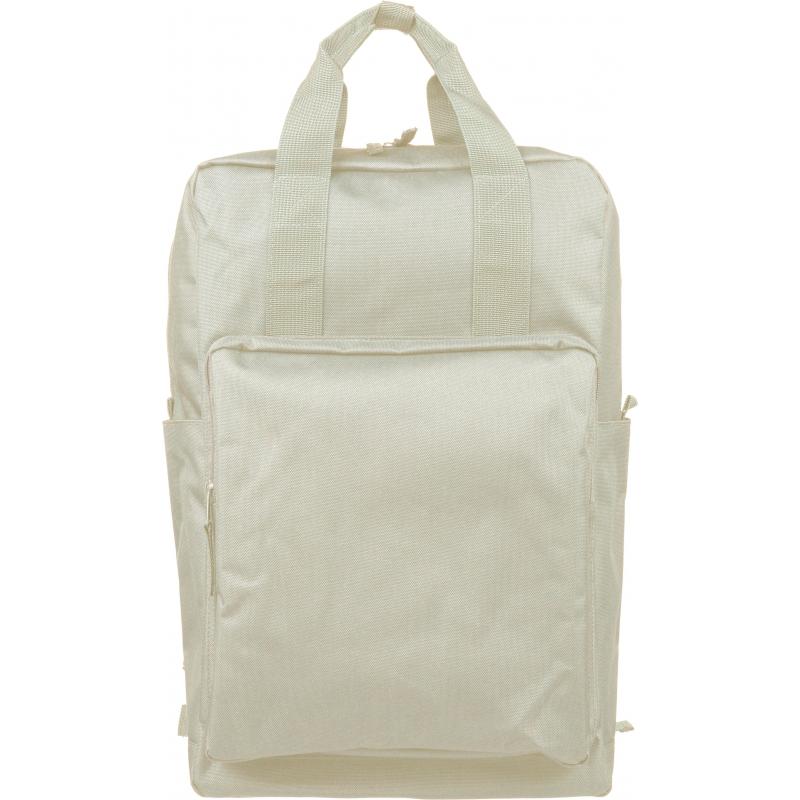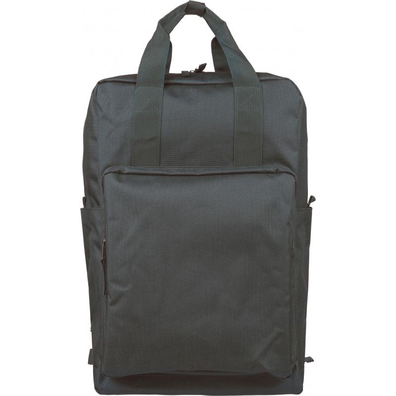 Rucksack aus recyceltem 900D-Polyester mit 210D-Futter und rPET-Etikett an der Seite. Mit großem Hauptfach mit Reißverschluss und 16-Zoll-Laptopfach, kleinerem Frontfach mit Reißverschluss, zwei Seitentaschen und Trolley-Gurt. Mit Tragegriffen mit Knopfverschluss und verstellbaren, belüfteten Schultergurten.