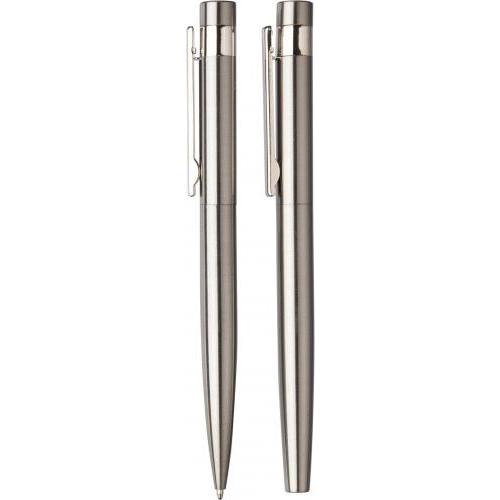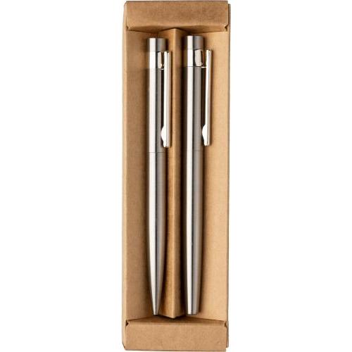 Recyceltes Stahl-Schreibset, bestehend aus einem Twist-Kugelschreiber und einem Rollerball-Stift, beide mit blauer Tinte. Enthält ein Logo aus recyceltem Edelstahl auf der Rückseite beider Stifte. Zusammen verpackt in einer Kraftpapier-Geschenkbox.