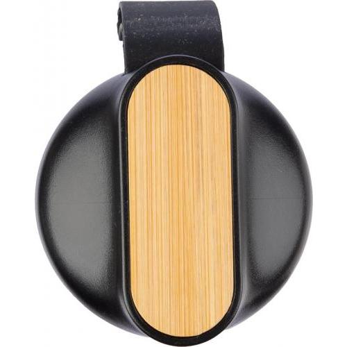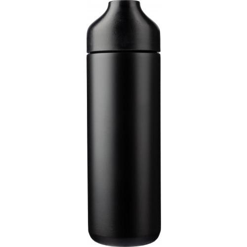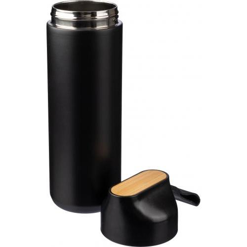Geschenkbox aus schwarzem Karton mit 3 Artikeln: eine vakuumisolierte doppelwandige Edelstahl-Trinkflasche (640 ml) mit PP-Deckel, Silikonband und Bambus-Detail auf dem Deckel. Die Innenseite ist aus Edelstahl 304, die Außenseite aus Edelstahl 201; ein Drehkugelschreiber aus Aluminium mit mattem Finish, blauer Schrift und einem Bambus-Detail auf dem Clip; und ein Notizbuch aus rPET (300D) (ca