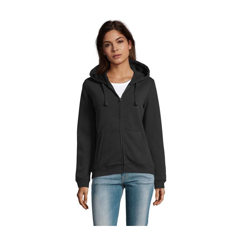 Sol's spike women. Damen hoodie kapuzenjacke mit durchgehendem reißverschluss. 80% ringgesponnene baumwolle - 20% polyester, angeraute innenseite. Außen: 100% fleece 280 lsf (low shrinkage fabric). Angesetzte ärmel, 2 känguru-taschen auf der vorderseite, geschnitten und genäht, gefütterte kapuze ton-in-ton-kordelzug, rippenbündchen am saum an den ärmeln 2x2. Halbmondpasse krageninnenseite, nackenband ykk-reißverschluss. oeko-tex®. Verkauf nur druck.
