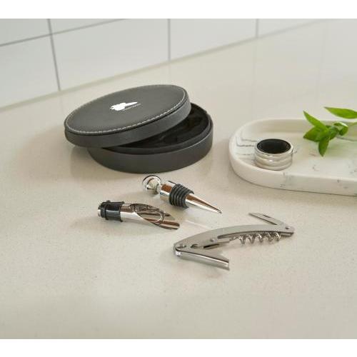 4-teiliges Weinset 'Cabernet', bestehend aus einem Weinverschluss, einem Korkenzieher, einem Tropfring und einem Ausgießer. Alle Artikel sind in einer Geschenkbox aus Kunststoff verpackt.