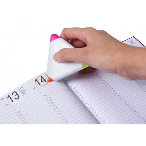 Textmarker 'Triangle' in Form eines Dreiecks aus Kunststoff. Jede Ecke hat eine unterschiedliche Farbe: pink, orange und gelb.