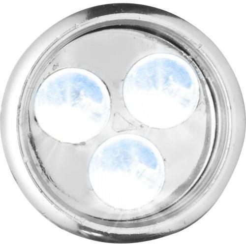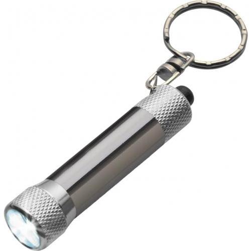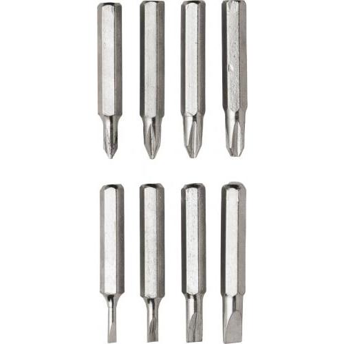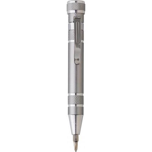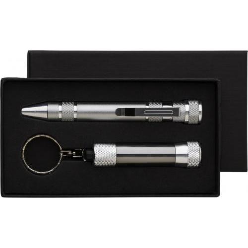 Werkzeug-Set aus Metall bestehend aus LED-Lampe (weiß) mit Schlüsselring und passendem Bit-Set (8-tlg.) mit Metallclip, verpackt in einer Geschenkbox.
